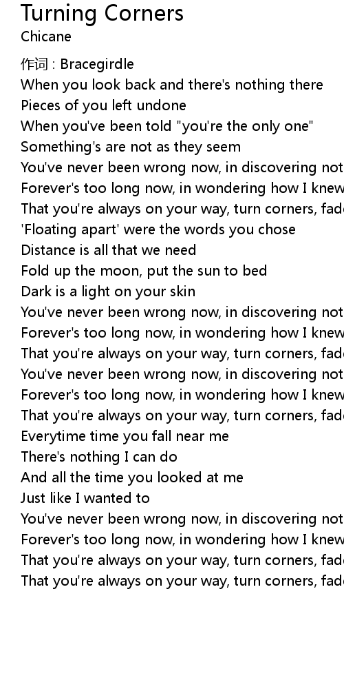 | That you' re always on your way, turn corners, fade to grey | |