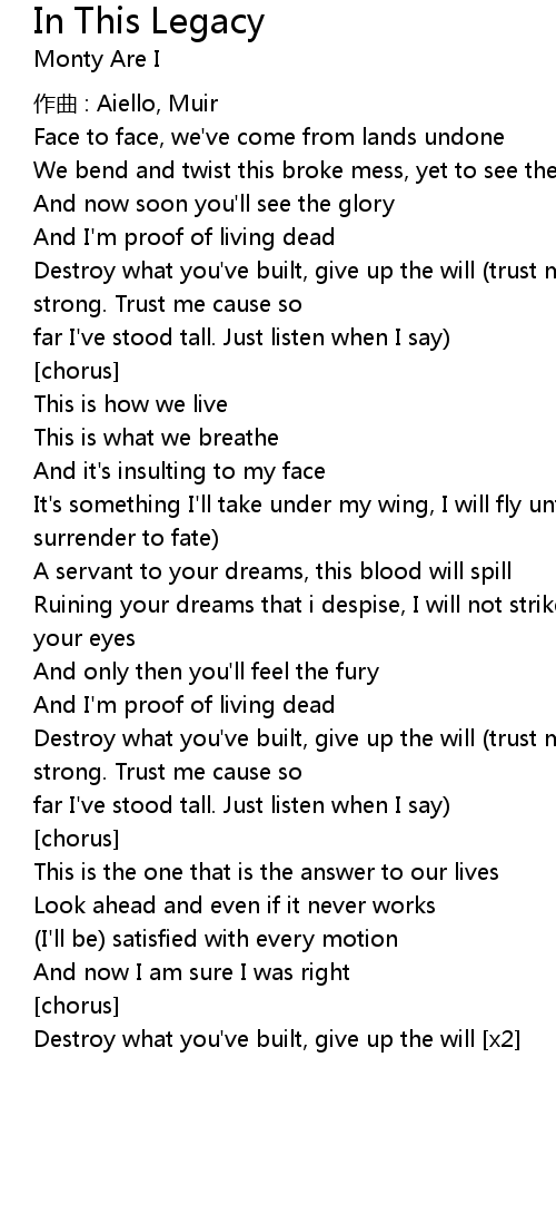 | Destroy what you' ve built, give up the will trust me, cause so far I' ve stood strong. Trust me cause so | |