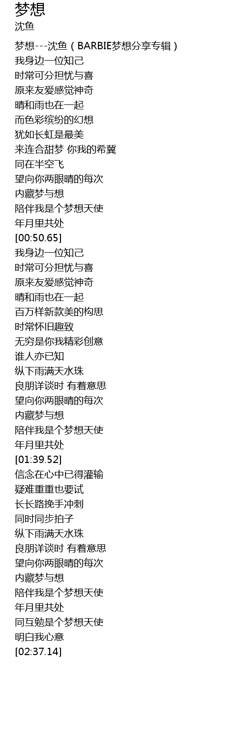 | [00:00.00] | 梦想---沈鱼(BARBIE梦想分享专辑) |
