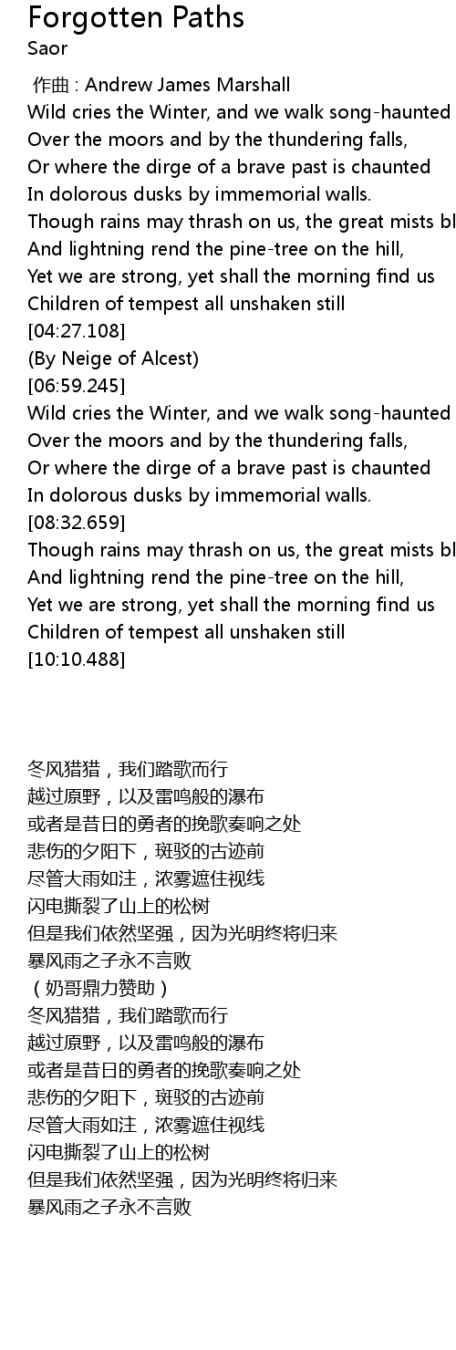 | [03:19.033] | Wild cries the Winter, and we walk songhaunted |