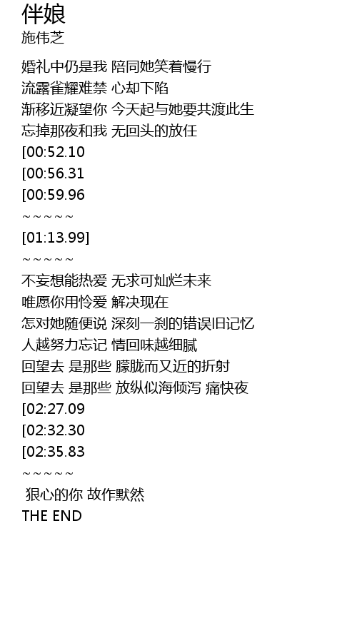 | [00:24.16] | 婚礼中仍是我 陪同她笑着慢行 |
