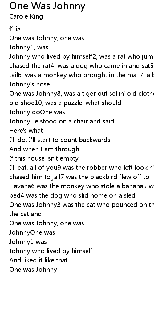 | Johnny who lived by himself2, was a rat who jumped on his shelf3, was a cat who chased the rat4, was a dog who came in and sat5, was a turtle who bit the dog' s tail6, was a monkey who brought in the mail7, a blackbird pecked poor | |