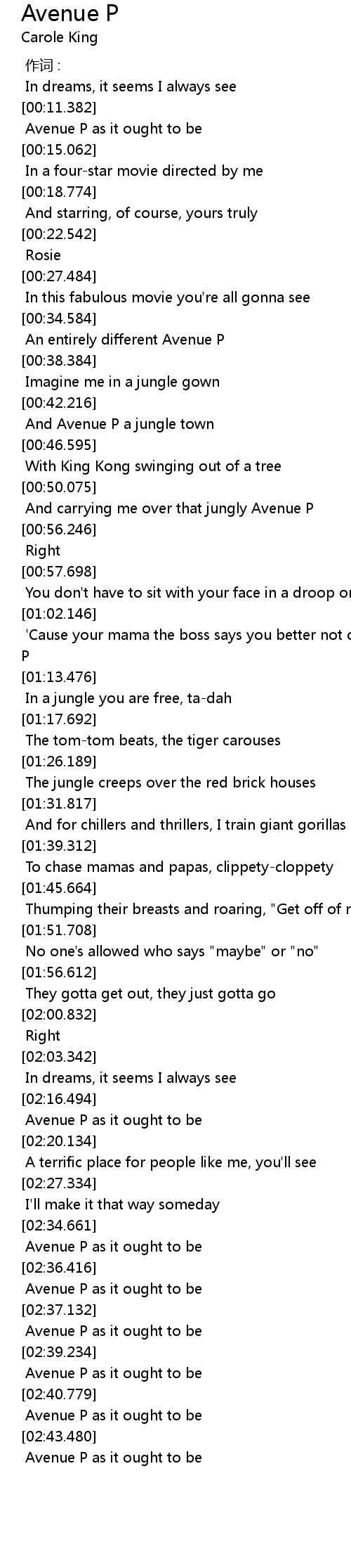 | [00:50.252] | And carrying me over that jungly Avenue P |