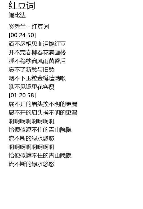| [00:26.49] | dī bù jìn xiāng sī xuè lèi pāo hóng dòu |