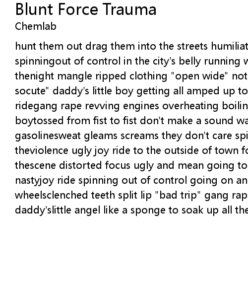 | hunt them out drag them into the streets humiliate them baseball bats spinningout of control in the city's belly running wild throughout the veins of thenight mangle ripped clothing "open wide" nothing you can do abduction "he's socute" daddy's little boy getting all amped up to split this toy ugly joy ridegang rape revving engines overheating boiling up exposed and bleeding little boytossed from fist to fist don't make a sound watch him squirm and twist gasolinesweat gleams screams they don't care spinning out of control drunk on theviolence ugly joy ride to the outside of town force his face down watch thescene distorted focus ugly and mean going to tear him up amped up for a nastyjoy ride spinning out of control going on an ugly joy ride spinning wheelsclenched teeth split lip "bad trip" gang raped bang bang he's so cute daddy'slittle angel like a sponge to soak up all the fluid braking off inside |