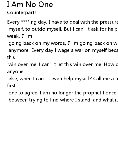 | myself, to outdo myself. But I can' t ask for help, I can' t admit I' m weak. I' m | |