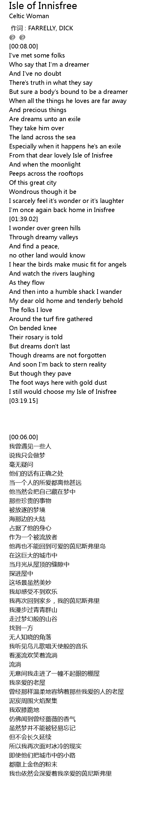 | [03:04.58] | I still would choose my Isle of Inisfree |