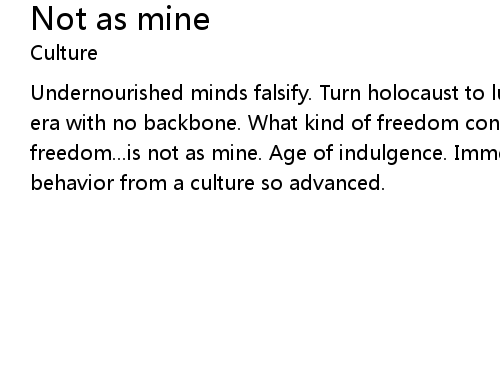 | Undernourished minds falsify. Turn holocaust to lullaby. Roushing the vein of an era with no backbone. What kind of freedom confines? Rapes the mind? Your freedom...is not as mine. Age of indulgence. Immediate gratification. Infantile behavior from a culture so advanced. |