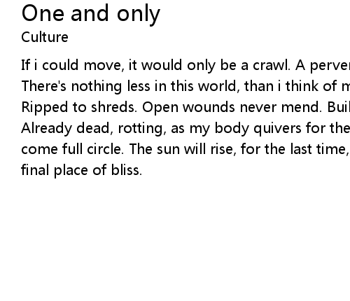 | If i could move, it would only be a crawl. A perverse creation of an angry man. There's nothing less in this world, than i think of myself. All my dignity lost. Ripped to shreds. Open wounds never mend. Built by strength to destroy myself. Already dead, rotting, as my body quivers for the last time. The prophecy has come full circle. The sun will rise, for the last time, as i'm lowered to my final place of bliss. |