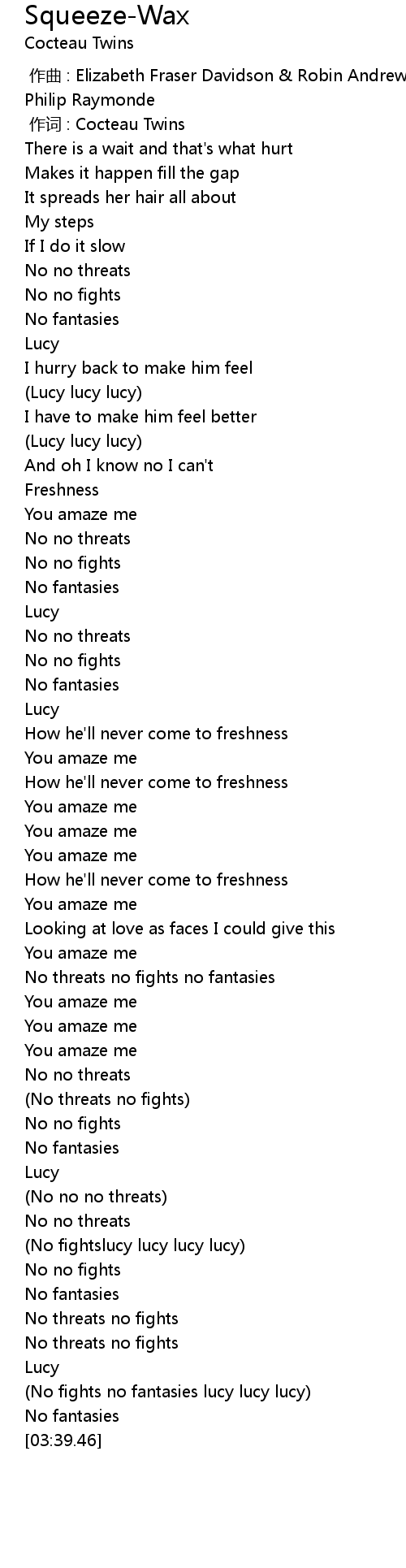 | [03:31.33] | (No fights no fantasies lucy lucy lucy) |