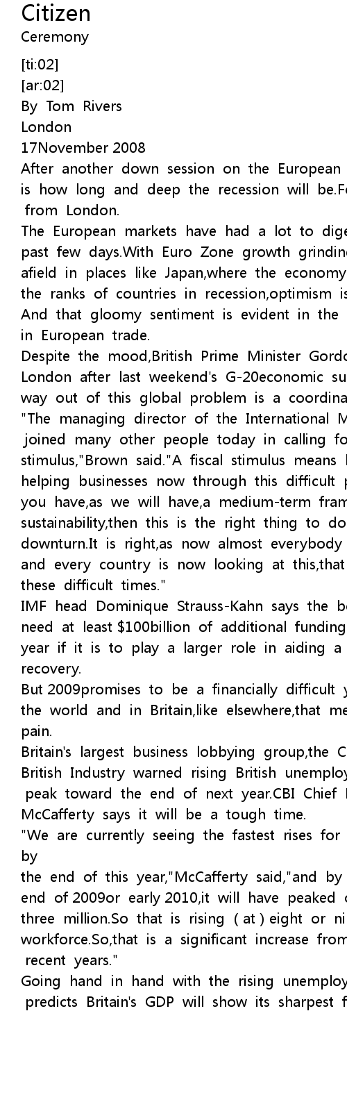 | [00:31.956] | " The managing director of the International Monetary Fund has joined many other people today in calling for a fiscal stimulus," Brown said." A fiscal stimulus means helping families and helping businesses now through this difficult position and as long as you have, as we will have, a mediumterm framework for fiscal sustainability, then this is the right thing to do facing the downturn. It is right, as now almost everybody accepts across the world and every country is now looking at this, that we help people through these difficult times." |