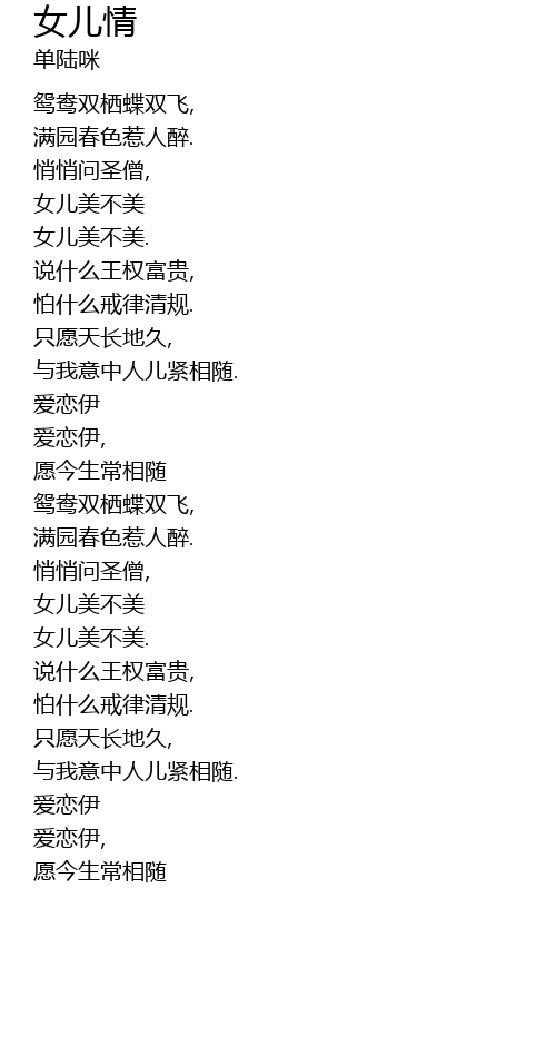 | [02:11.32] | 鸳鸯双栖蝶双飞, |