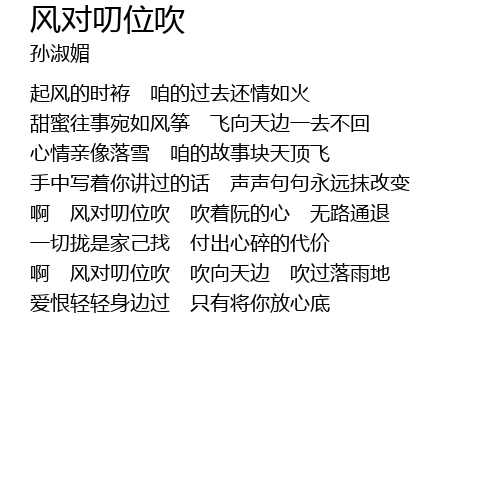 | 啊 风对叨位吹 吹向天边 吹过落雨地 | |