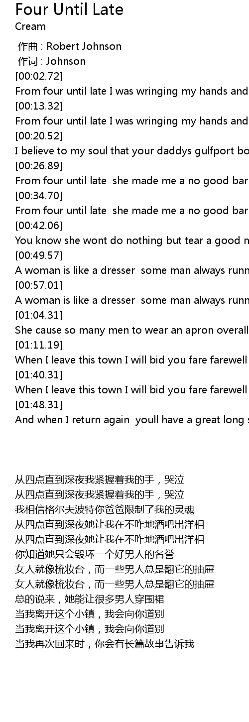 | [00:15.14] | From four until late I was wringing my hands and crying |