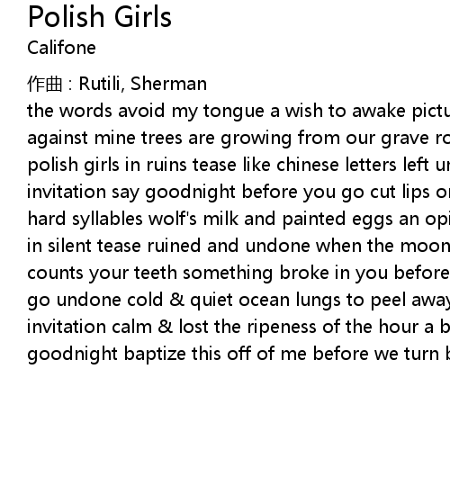 | the words avoid my tongue a wish to awake pictureless to lean your fever up against mine trees are growing from our grave roots are tangled in our bones polish girls in ruins tease like chinese letters left undone on a black wall invitation say goodnight before you go cut lips on frozen words cracked teeth on hard syllables wolf' s milk and painted eggs an opium eaters dream polish girls in silent tease ruined and undone when the moon decides to show a writing spider counts your teeth something broke in you before your heart stopped ticking you go undone cold quiet ocean lungs to peel away time distance a black wall invitation calm lost the ripeness of the hour a black wall invitation say goodnight baptize this off of me before we turn bad |