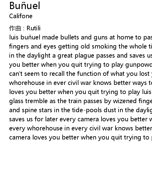 | luis bu uel made bullets and guns at home to pass the time away with careful fingers and eyes getting old smoking the whole time stars in the tidepools dust in the daylight a great plague passes and saves us for later every camera loves you better when you quit trying to play gunpowder stains lose all sense of time can' t seem to recall the function of what you lost yourself in making every whorehouse in ever civil war knows better ways to make you wait every camera loves you better when you quit trying to play luis bu uel watching the wine glass tremble as the train passes by wizened fingers revolution and lust soul and spine stars in the tidepools dust in the daylight a great plague passes and saves us for later every camera loves you better when you quit trying to play every whorehouse in every civil war knows better ways to make you wait every camera loves you better when you quit trying to play |