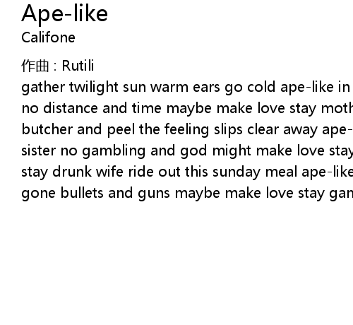 | gather twilight sun warm ears go cold ape-like in prayer still and gone sister no distance and time maybe make love stay mother hold tight milk drunk easy mind butcher and peel the feeling slips clear away ape-like held ground still around sister no gambling and god might make love stay a common enemy maybe make love stay drunk wife ride out this sunday meal ape-like undone quiet wife still and gone bullets and guns maybe make love stay gambling and god fly home fly home |