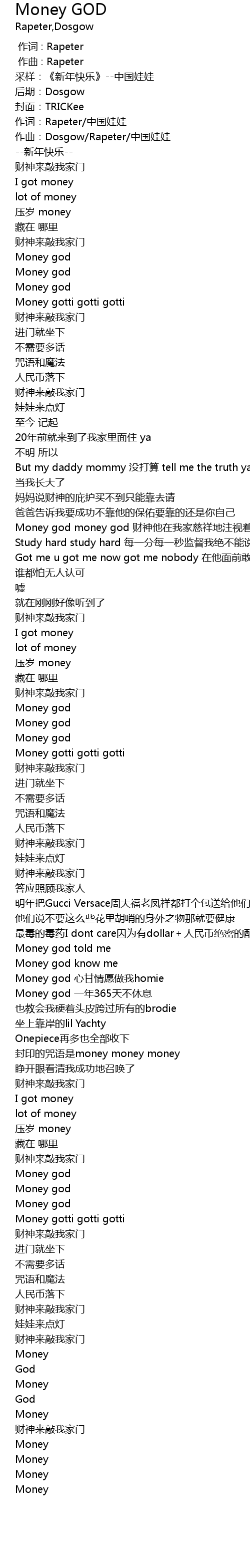 | [00:58.735] | Money god money god cái shén tā zài wǒ jiā cí xiáng dì zhù shì zhe wǒ zhǎng dà |
