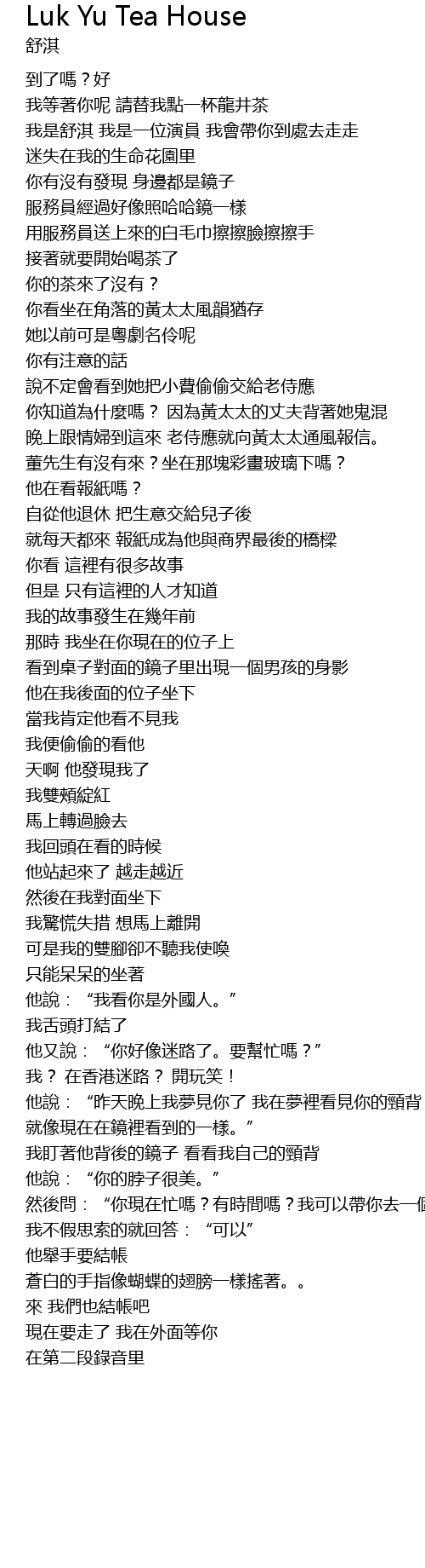 | [00:14.20] | 我等著你呢 請替我點一杯龍井茶 |