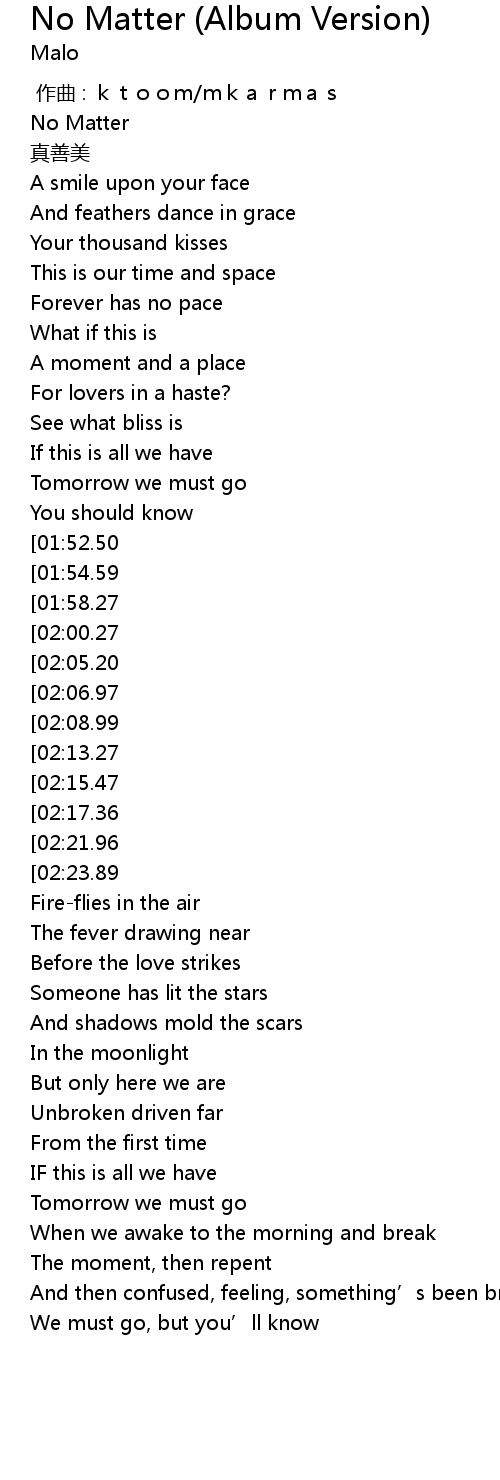 | [03:23.73][02:15.47][01:06.86] | I’ll ask no more |