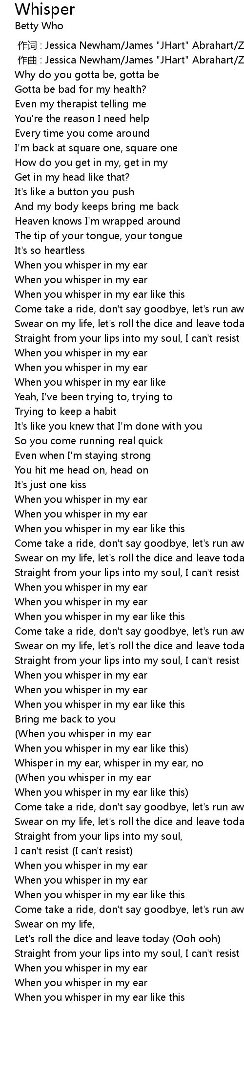 | [02:20.86] | Whisper in my ear, whisper in my ear, no |
