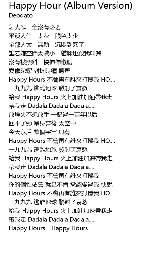 | [02:45.00] | Happy Hours 不會再有誰來打攪我 HO.... |
