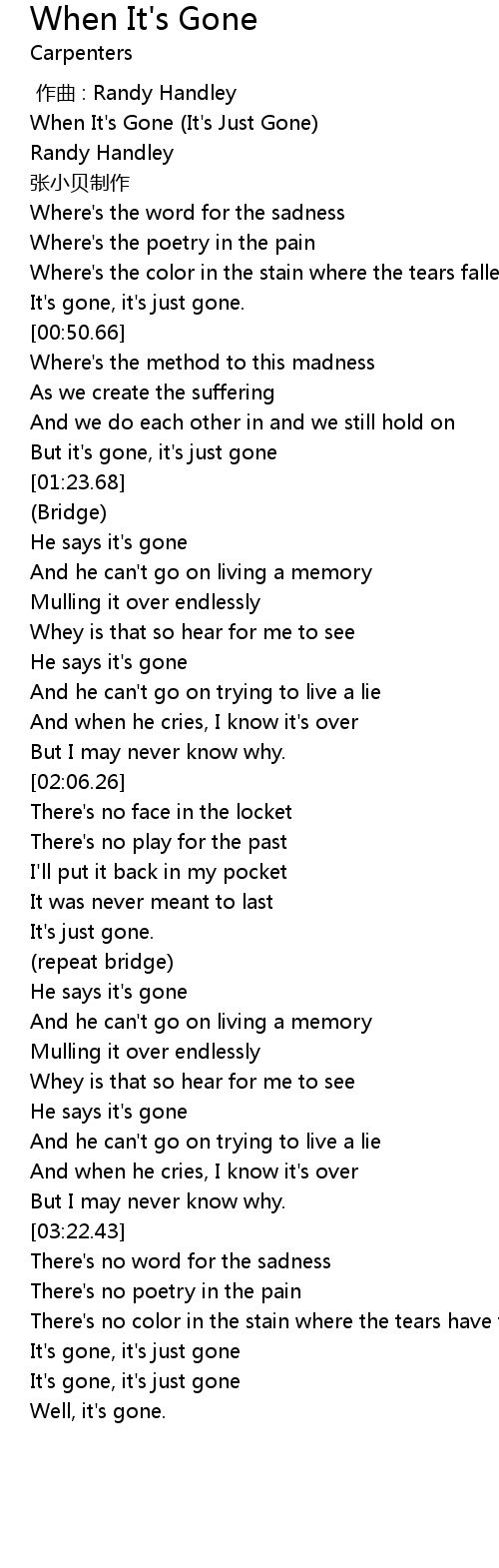| [00:00.00] | When It's Gone (It's Just Gone) |