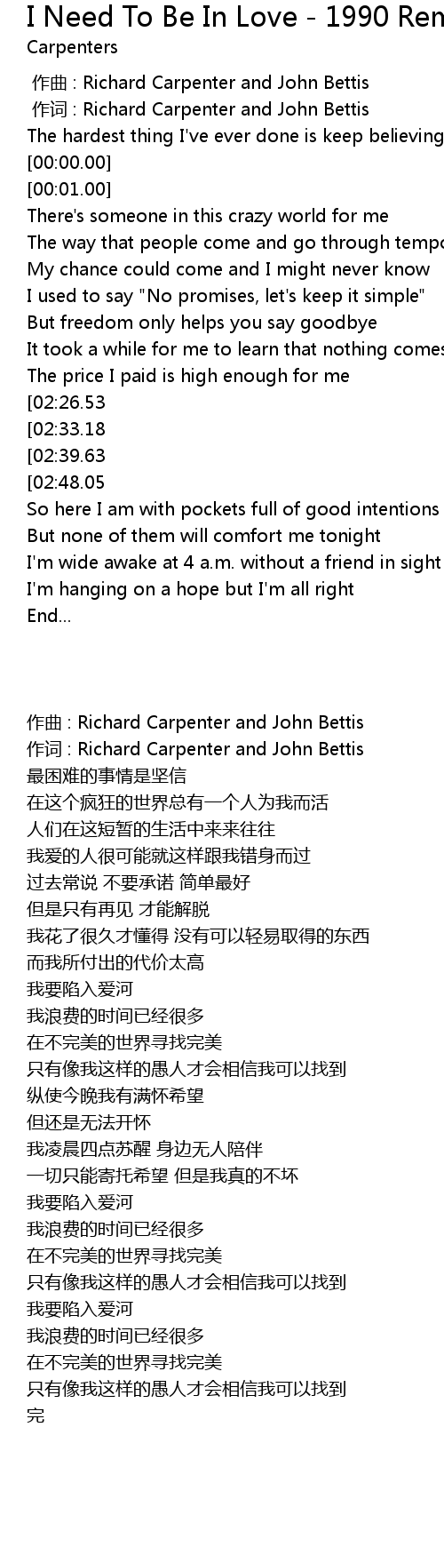 | [02:54.86][02:26.53][01:24.07] | I know I need to be in love |