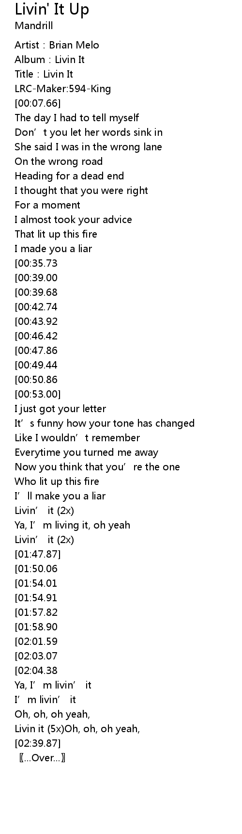 | [02:26.00] | Livin it (5x)Oh, oh, oh yeah, |