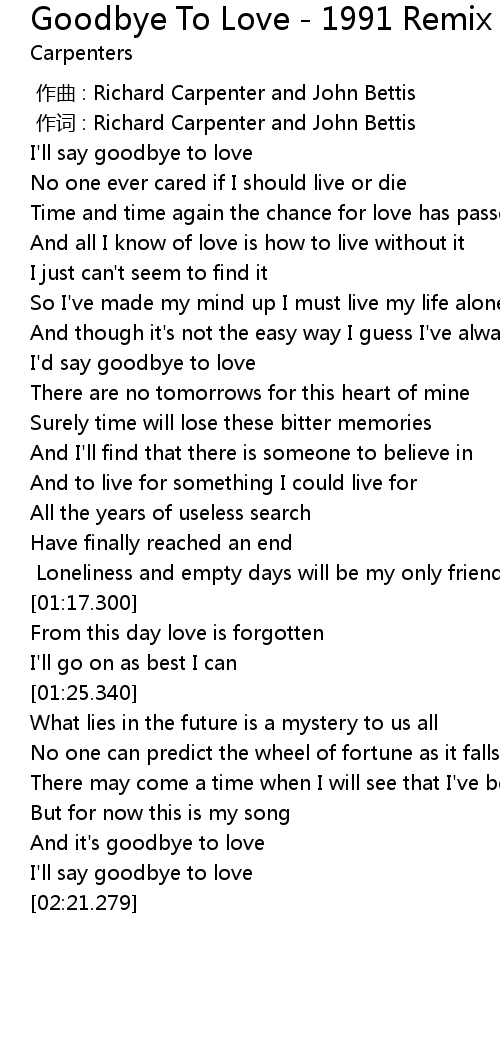 | [02:10.379] | And it' s goodbye to love |