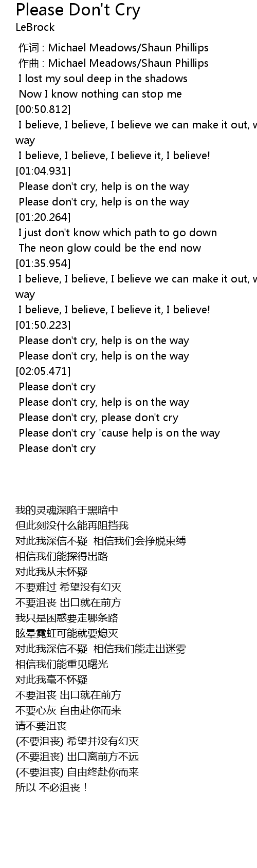 | [03:24.906] | Please don' t cry, please don' t cry |