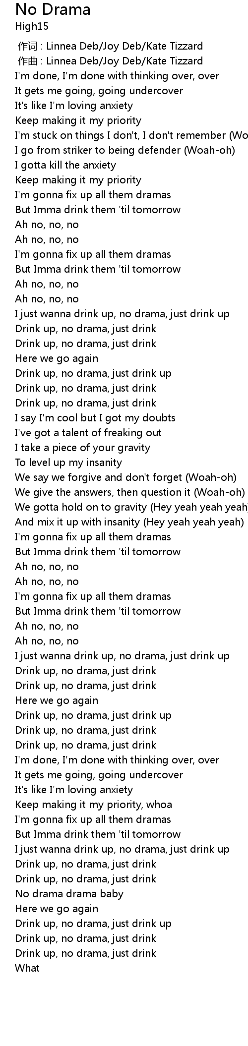 | [02:49.58] | Drink up, no drama, just drink |