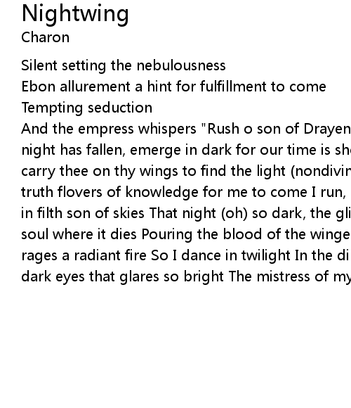 And the empress whispers "Rush o son of Drayen for our guest is infinite Fly the night has fallen, emerge in dark for our time is short (so short) Let the wind carry thee on thy wings to find the light (nondivine) Search the blackrose of truth flovers of knowledge for me to come I run, I crawl, I haste, I prowl Crawl in filth son of skies That night (oh) so dark, the glimmer that arches over my soul where it dies Pouring the blood of the winged of light Inside my heart rages a radiant fire So I dance in twilight In the dimlight of morningstar Her dark eyes that glares so bright The mistress of my midnight |