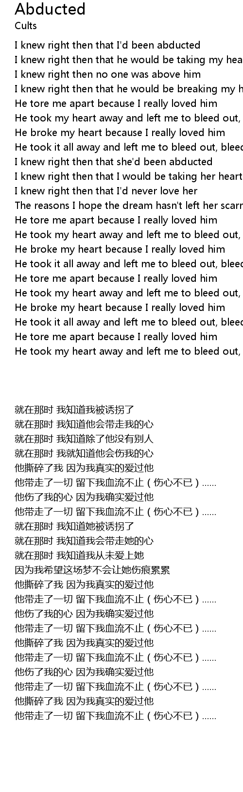 | [00:11.42] | I knew right then that I'd been abducted |