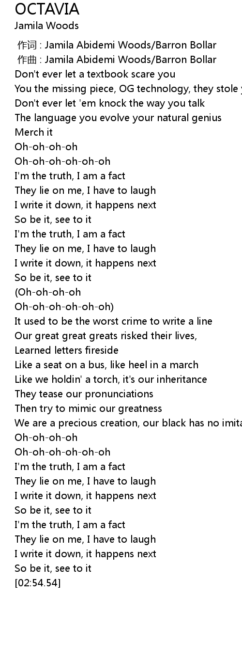 | [00:00.000] | 作词 : Jamila Abidemi Woods/Barron Bollar |