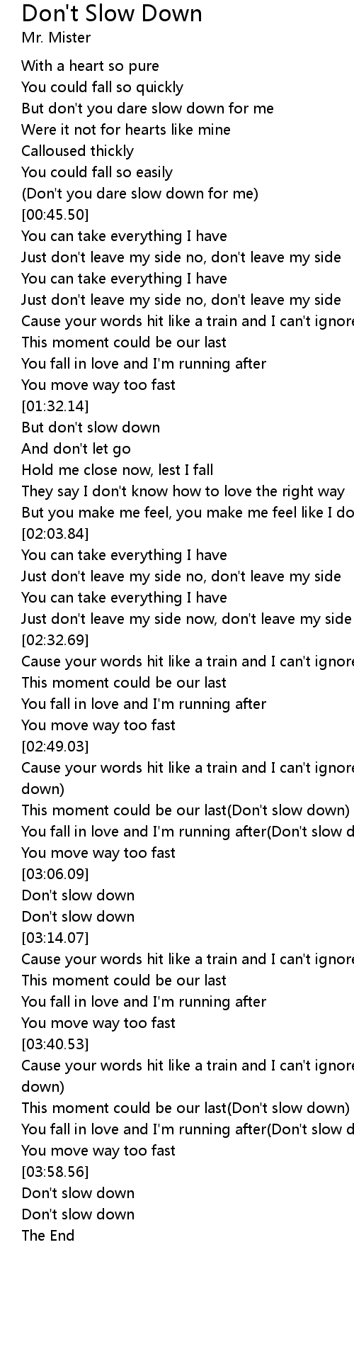 Cause your words hit like a train and I can't ignore it(Don't slow down) |