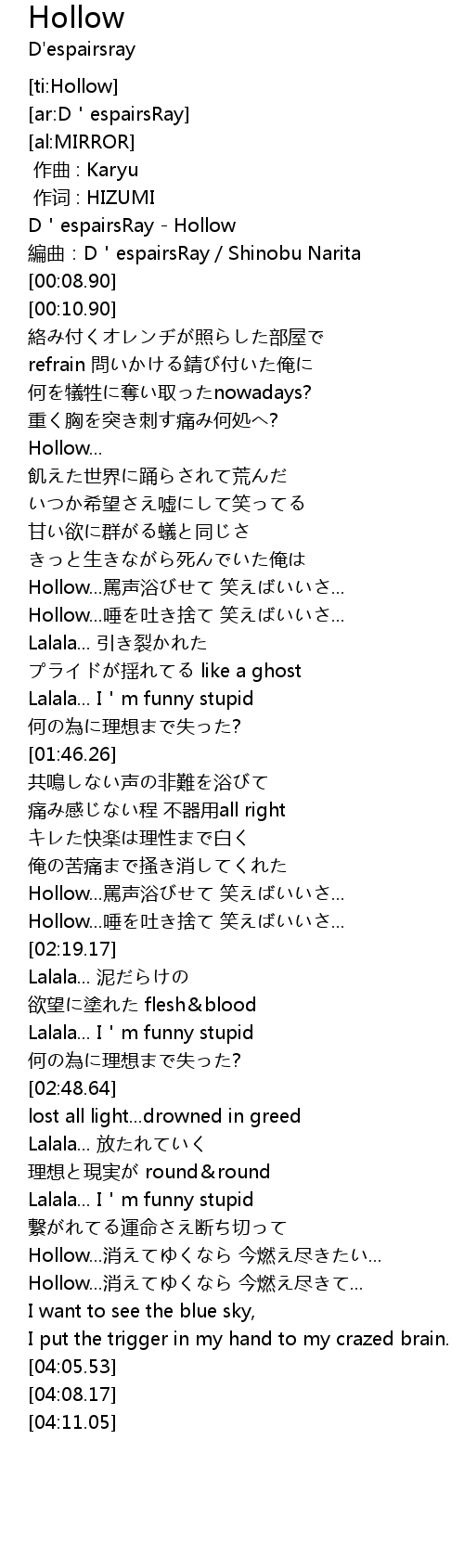 | [02:07.98] | Hollow...罵声浴びせて 笑えばいいさ... |