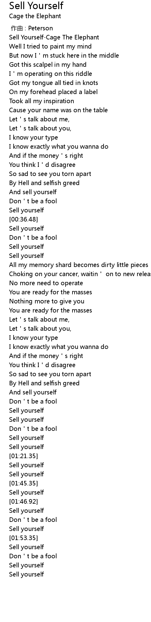 | [00:01.53] | Sell Yourself-Cage The Elephant |