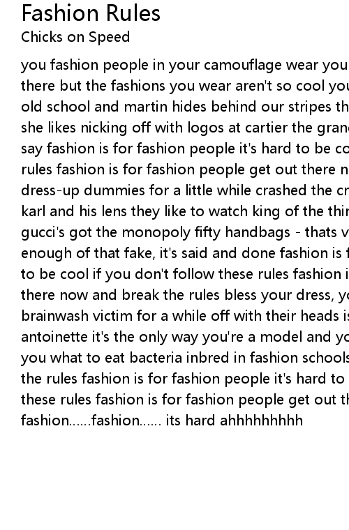 | you fashion people in your camouflage wear you think you' re really quite up there but the fashions you wear aren' t so cool you really should go back, you' re old school and martin hides behind our stripes the tshirts yeah! that' s what she likes nicking off with logos at cartier the grand mister d, or charly, some say fashion is for fashion people it' s hard to be cool if you don' t follow these rules fashion is for fashion people get out there now and break the rules dressup dummies for a little while crashed the crash party in real chicks style karl and his lens they like to watch king of the thing but we dont give a. gucci' s got the monopoly fifty handbags thats victim' s luxury voguefied in 01, enough of that fake, it' s said and done fashion is for fashion people it' s hard to be cool if you don' t follow these rules fashion is for fashion people get out there now and break the rules bless your dress, you' re out of style you' re a brainwash victim for a while off with their heads is what we say after marie antoinette it' s the only way you' re a model and you walk the beat they even told you what to eat bacteria inbred in fashion schools get out there now and break the rules fashion is for fashion people it' s hard to be cool if you don' t follow these rules fashion is for fashion people get out there now and break the rules fashion fashion its hard ahhhhhhhhh |