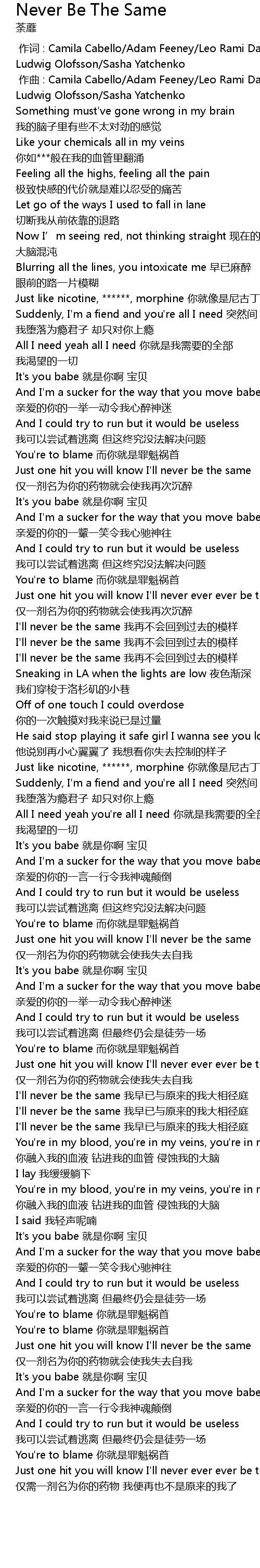 | [02:23.662] | Just one hit you will know I'll never be the same 仅一剂名为你的药物就会使我失去自我 |