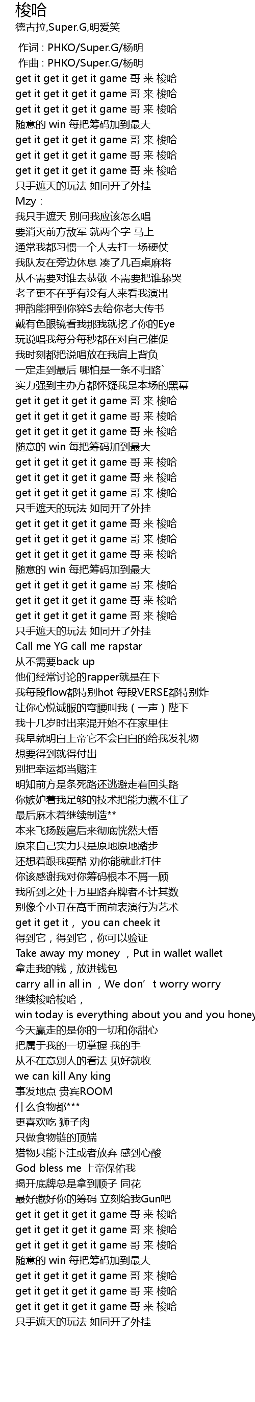 | [01:23.420] | get it get it get it game 哥 来 梭哈 |