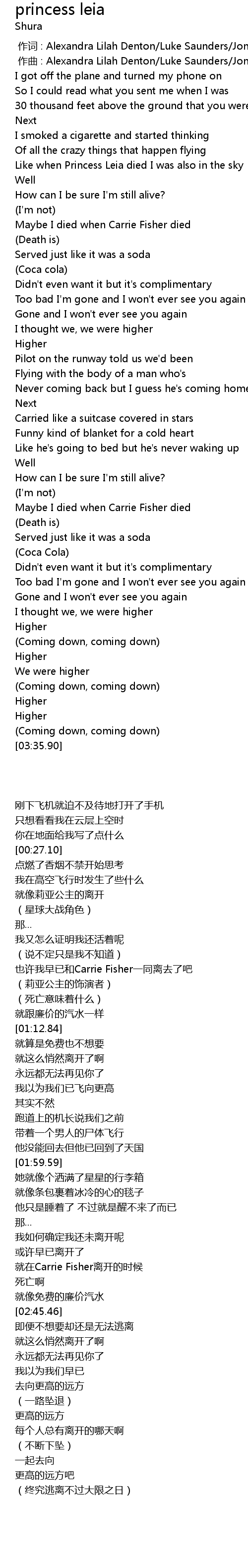 | [00:38.10] | Like when Princess Leia died I was also in the sky |