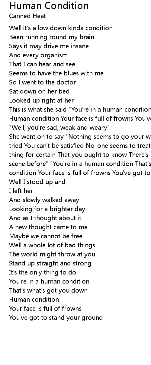 This is what she said "You're in a human condition That's what's got you down Human condition Your face is full of frowns You've got to stand your ground" "Well, you're sad, weak and weary" |