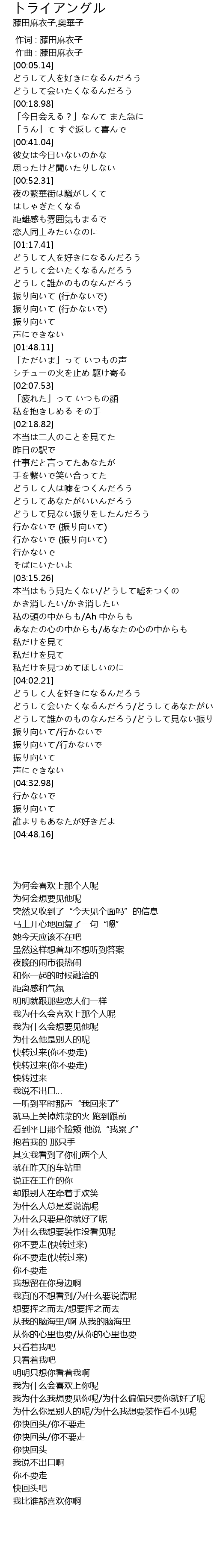 | [04:13.85] | どうして誰かのものなんだろう/どうして見ない振りをしたんだろう |