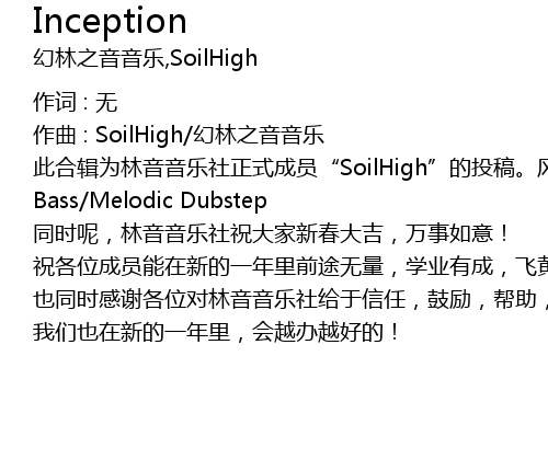 | 此合辑为林音音乐社正式成员“SoilHigh”的投稿。风格:Future Bass/Melodic Dubstep | |