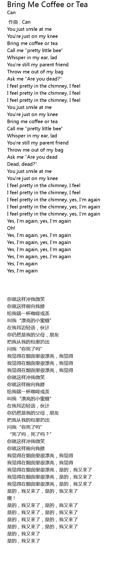 | [03:55.43] | I feel pretty in the chimney, yes, I' m again |