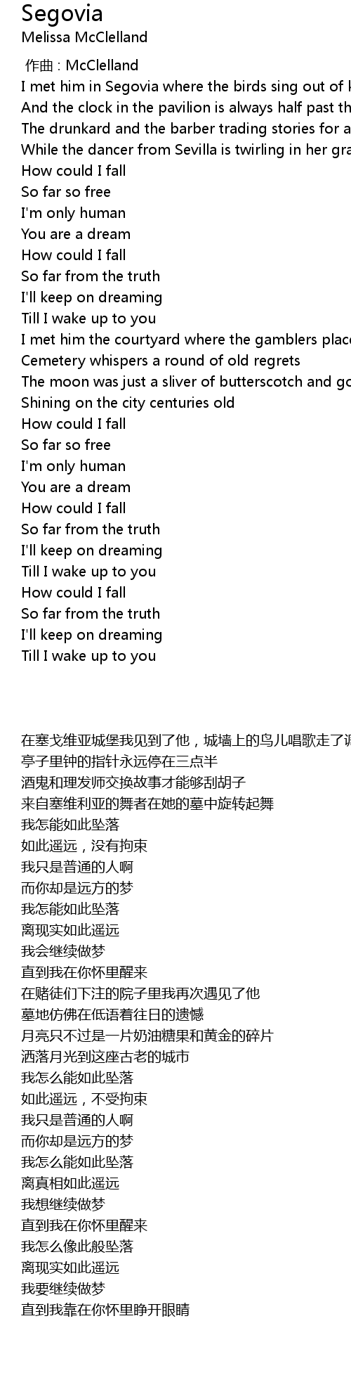 | [00:17.000] | I met him in Segovia where the birds sing out of key |