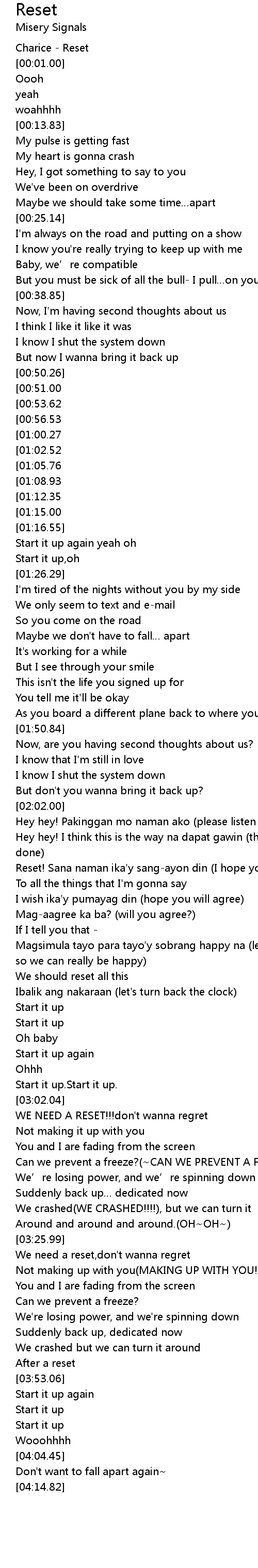 | [02:33.91] | Reset! Sana naman ika'y sang-ayon din (I hope you also agree) |