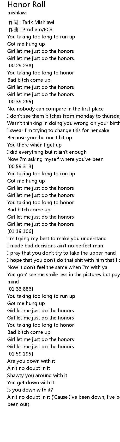 | [01:31.884] | You gon' see me smile less in the pictures but pay no mind, pay no mind |