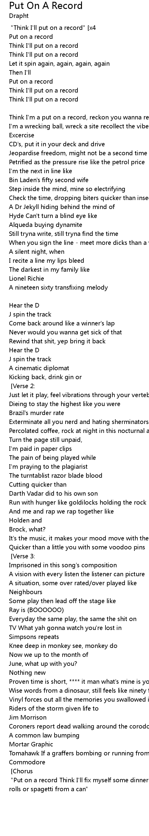 [Hook: {Old vocals sample}] "Think I'll put on a record" [x4] [Chorus:] |